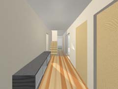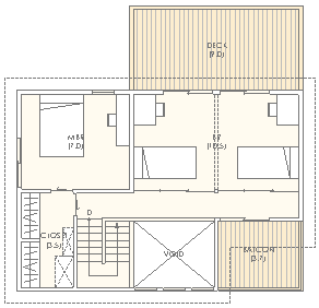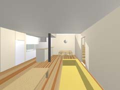 | 計画地 :横浜市青葉区 | 北向きひな壇の造成地。擁壁により道路より4m近く敷地地盤が高く、したがって道路面の北と西に向かって眺望が良く、南側は逆に隣地地盤が2mほどさらに高くなっている。北向きの眺望の確保、南からの日照の確保、パブリック、プライベート2種の異なる外部デッキスペース、約1800万円のローコストを要件に設計を行っている。極力シンプルな総2階建てのボリュームにデッキスペースを付加すること及びもう1種のデッキスペースを切り取ること、内部吹抜による日照の獲得と家族の気配を感じられるようにすること。標準的な敷地規模及び家族構成のためにローコスト住宅のひとつのプロトタイプとして考えることもできる。 |