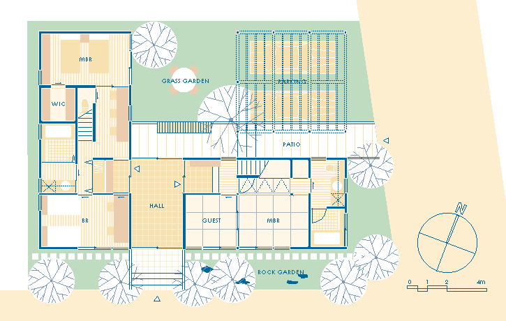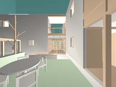 | 計画地 :神奈川県海老名市 | 南と東を6m道路に接した角地の、まとまった広さをもつ住環境の良い敷地である。親世帯の既存住宅が老朽化したのを機に2世帯住宅への建て替えを計画された。南面する間口が広い敷地の利点を活かし、建物は敷地の北東部を空地としたL字型の形状に配置され、北側の隣家への日照も配慮されている。2世帯の居住形態は同一棟への同居や1階に親世帯、2階に子世帯という分離形式よりも隣居形態が最善であろうという考えから、それぞれ総2階建ての2棟にいったん明確に分離されたうえで、共有部分となる半外部的空間(土間、テラス)で結合されている。将来的な家族構成の変化に伴い、その結合部分を内部化することで2棟から1棟化への移行が容易に可能となり、生活の変化に追従する耐用性の向上へと寄与させている。 |