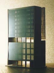 | 計画地 :東京都 | 東京都内の密集地に、今後の都市住宅の姿を考慮した上で、集合住宅と他用途の施設との複合施設を計画せよという課題である。低層部に生活利便施設としての店舗と駐車場、事務所、高層部に集合住宅と単純に用途は振り分けられた。集合住宅専用のELVに乗り換える中間階に2つの用途の緩衝帯、そして居住空間へのゲート的な通過空間として、オープンなルーフテラスが設けられた。集合住宅部分はスレンダーな平面形のまま積層され、隣地との間に空隙をとって配置された。住戸は前面道路側と隣地側を大きく開放されつつも、隣地境界にそって避難階段の代わりに設けられたスロープボックス(メッシュで覆われ緑化された箱)がプライバシーをまもるとともに、立体化された緑道として住戸内からの視線、アプローチ動線を楽しく快適なものへと変質させている。 |