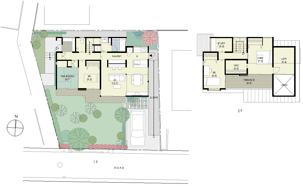 | 計画地 :東京都府中市 | 茶道教室を営む奥様のお母様の住む御実家を建替えて2世帯で同居するための家とする計画。2階にあった8畳の茶室は1階に4畳半の小間として配置し直して既存の茶庭を縁側越しに望めるようにした。南側に前面道路があるが玄関はこれも既存の家のままに西側の通路に向けて設けている。バリアフリーを考慮して水廻りなどの共用部分は1階に設け、2階は子世帯の専用部分とした。建物は南面が開放的な凹凸の多い形状を軒の深い切妻屋根で覆っている。 |