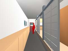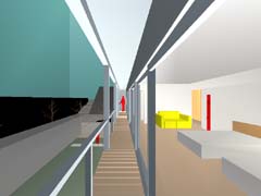 | 計画地 :川崎市多摩区 | 太陽光発電、オール電化、高気密高断熱、計画換気、その上ローコストと昨今はやりのアイテムが目白押しの住宅の計画。南面接道で接道幅が広く、道路の対面にも住居がない(4Mほど地盤が高い位置に小さな墓地がある)という好条件を活かすべく、建物は東西に長い単純な直方体とし、南面を日照を得るための開口面として(ほぼフラットな屋根上に太陽光発電ユニット搭載)、敷地の北側にぽつんと置いているという状態で配置。敷地の南側の空地は(コスト面の制約もあり)特に外構計画もしないで、南道路と住居間の緩衝地帯及び予備駐車スペースとして空地のままとしている。高気密高断熱、計画換気、電気式蓄熱型床暖房を有効に作用させ、かつローコスト化を突き詰めるため、内部はなるべく間仕切の少ないワンルーム空間と出来るように試みている。内部空間の南面を囲うように、半外部空間を纏わせて、大きな開口面に対する夏場の日照低減及び、室内外の回遊性を持たせるための空間としている。 |