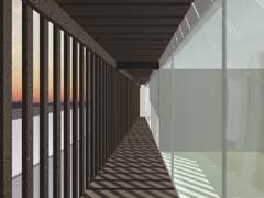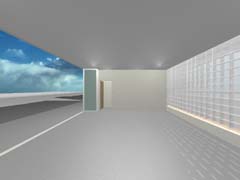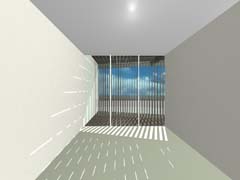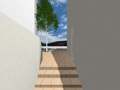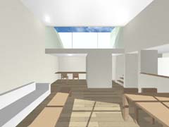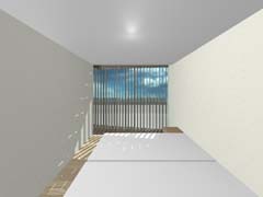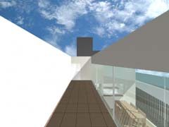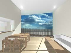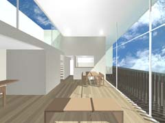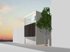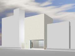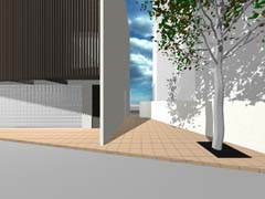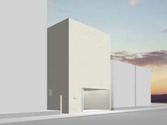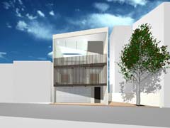 西側を鎌倉街道(22m)、東側を旧道らしき6m道路にはさまれたとても面白い敷地である。長屋スタイルの飲食店舗や、大きカーディーラーなどが鎌倉街道に面して軒を連ねている。夫婦2人+αの住居と鎌倉街道沿いに向いた店舗スペースを設けて、ゆくゆくは建主自らバーやカフェを営みたいということであった。非常に限られた予算内で、建主直営(建主は内装業)にてやれるものは全て自分で工事を行うということであり、1階の店舗は貸店舗にもできることが望まれた。 ローコストを考慮した計画として、いびつに変形した敷地の中から斜線の影響を受けない単純な3.5層のボリュームをとり出し、余った部分を表裏の道路を貫通する路地(パティオ)兼駐車場のスペースとしている。1階を店舗、2階を寝室、天井が高く開放感のある3階を居間とし、騒音が心配される西面には店舗の開口部のみしか設けていない。比較的静かで人通りの少ない東側道路に向けて住居の開口を大きく設け、寝室及び浴室のプライバシー確保のため木製ルーバーでゆるく視線を防御している。モダン風とビルっぽくない南国風という夫婦間で相違するテイストが示されたが、2面道路が功を奏して建物自体に表裏2つの異なる表情をもたせることができた。 |