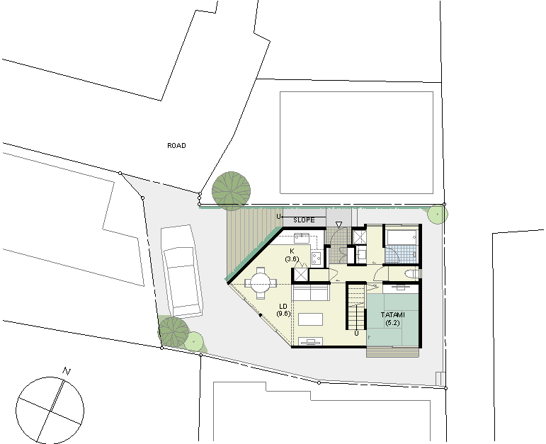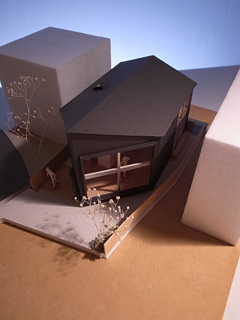 | 計画地 :横浜市保土ヶ谷区 | 商業地に近い横浜の下町。道路整備が整うよりも先に小住宅が建てられることで形成されてしまったような街区であり、世代交代とともに借地を買い取って住宅の建替えが進んでいて、三階建のプレハブ住宅や店舗、空き地の駐車場、トタン張りの古い住宅などにバラバラに囲まれた敷地である。 敷地は奥まった私道とかろうじて接道しているようないびつな形状の敷地であり、周辺の建物や住民との距離が近すぎているために、騒音や採光などの問題が生じやすくなっているようである。 この場所に長く住まわれてきた、リタイアされた御夫婦とその母親のための住宅の建替え計画であるが、少人数かつ高齢の家族であることと、建設予算を抑えるために建物は極力小さくして介護に備えたバリアフリーの住宅としている。周辺の建物が迫った奥まった敷地であるため建物の表情が作りにくいが、斜めの壁を持った5角形の建物として、この街区への調和しつつ屹立する存在感のある建物とすると同時にプライバシーの確保にも配慮している。 小さな建物であるが大きな吹き抜けを備えることで限られた時間帯の日照の確保と、低ランニングコストの全館空調を備えることを前提としている。 |