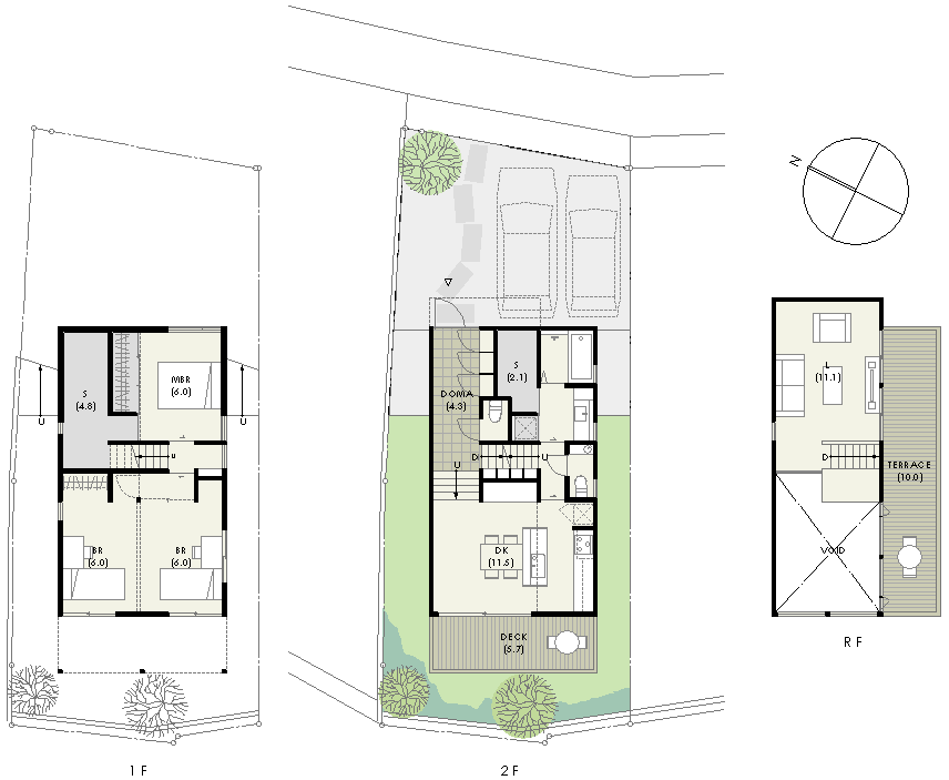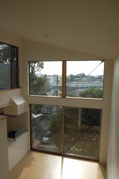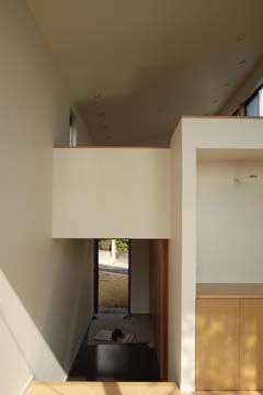 | 計画地 :神奈川県三浦郡葉山町 | 山あいの少々鬱蒼とした雰囲気のある南斜面地での計画。遠くには海を少し望むこともできる立地である。道路より下る斜面地のため、地上2階建ての中2階レベルを玄関としたスキップフロアの構成とした。天井が高く南西隣地の緑が望めるダイニングと、海を望める広い屋上テラスにつながる最上階リビングとは吹き抜けを介した一体的な空間としつつも、適度な距離感で隔てられている。法的に3階建ては厳しいために2階建てとしつつ半階高さのロフトを2ケ所に設けることで極力収納量を確保している。 |
