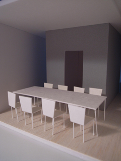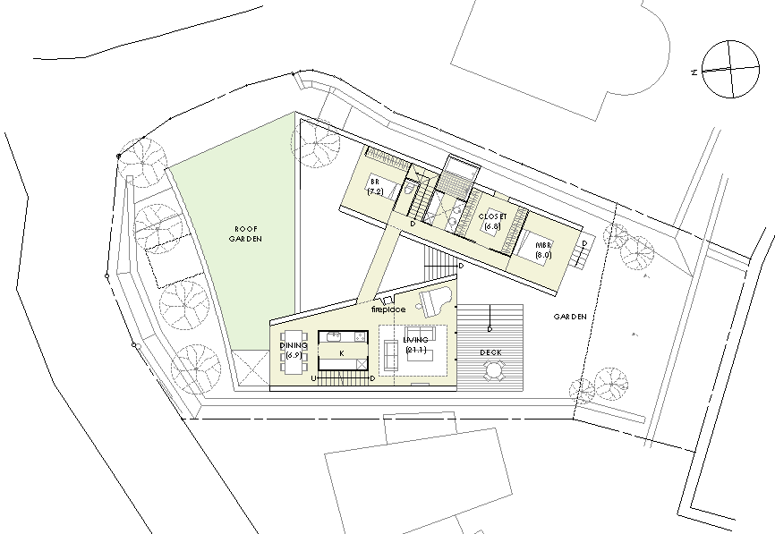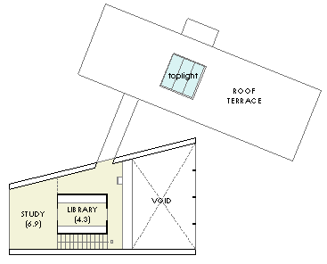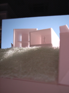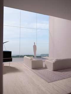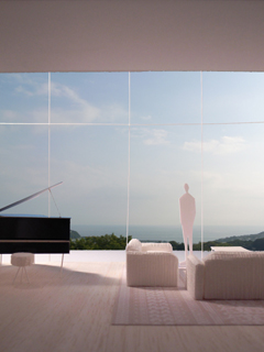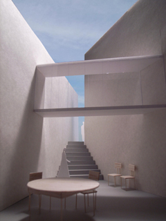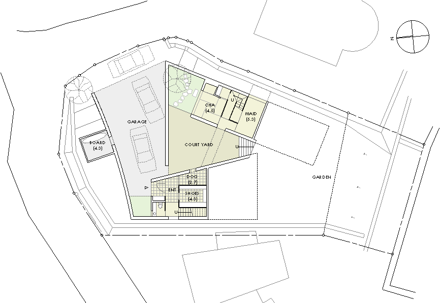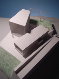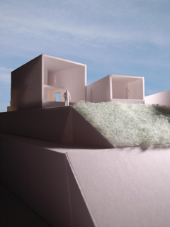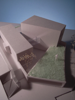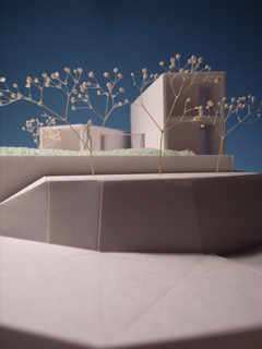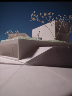 | 計画地 :神奈川県鎌倉市 | 海を見下ろす山頂付近に位置する広い敷地。少し変形した敷地の外周に沿うように、形態や用途の異なる3つの建物を少しずらしながら配置することで、海や周辺の緑への眺望を切り取るとともに空間相互の奥行感を生み出している。三棟に囲まれた中庭は周辺の建物や海風に影響されず空だけを切り取って眺めることの出来る快適な空間となるはずである。 |