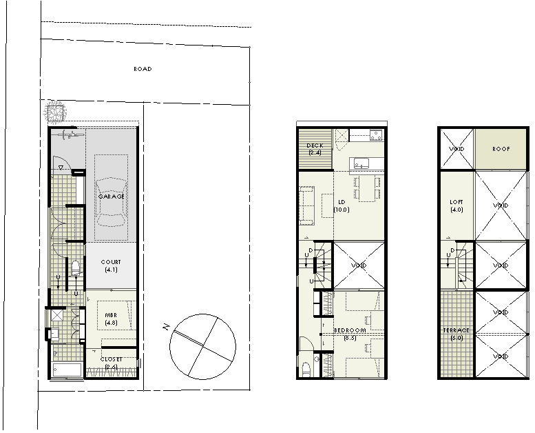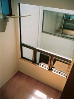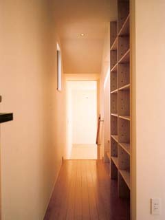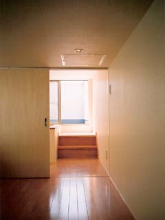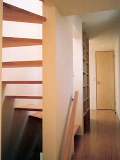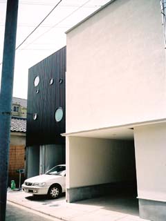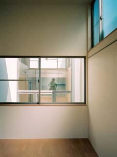 | 計画地 :神奈川県横浜市鶴見区 | 敷地の東側にて接道していて北側も狭い路地(旧水路)に面しているものの、東には中層のビル、南には本計画と同様の2.5層の住宅が建ち並んでいて日照があまり望めない敷地である。建物は敷地一杯に2階建て+ロフトのボリュームを囲い取った中に4畳半弱の広さのプライベートな中庭(光庭)を設けている。2階リビングとして天井を高くするとともに、中庭に面する大窓、南側の高窓を設けることで居間や子供部屋への採光を十分確保している。また中庭とは別にキッチンに面するサービステラスやロフトと同じレベルに一部屋上テラスを設けることで、密集地の中でのプライバシーを確保しつつ、外部空間を室内に積極的に取り入れるようにしている。 |
