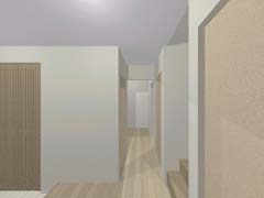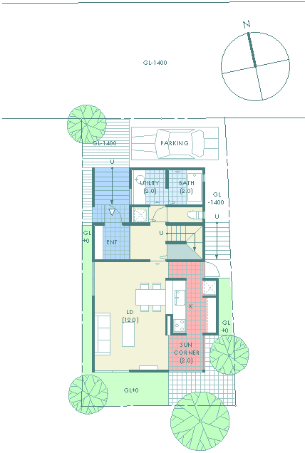 | 計画地 :石川県金沢市 | 雪の多い地方における建売住宅の計画。サンルームがあると大変喜ばれる場所柄とのこと。北側の道路面より敷地地盤は1.4mほど高く、南側にはさらに高く「裏山」が近接していてあまり多くの日照は望めなさそうである。100平米そこそこの敷地に3LDKという一般的な要件であり、建物の計画自体も非常に単純明解なものとしているが、陽だまりとなる場所を設け、外観をシンプルかつ抽象的なものとして差別化を図っている。 |