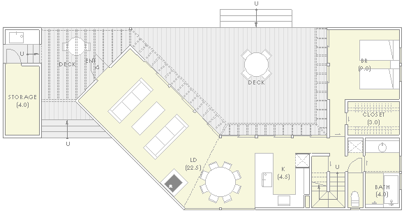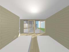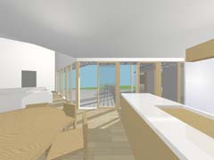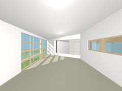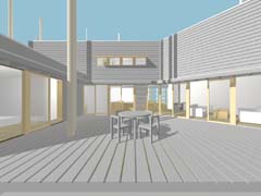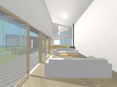 | 計画地 :長野県軽井沢町 | 敷地は森そのものである。何物にも邪魔されないパノラミックな森の景観を得ることも可能だけれども、建屋自体によってある程度風景を切り取ることで窓越しの景観が単調にならないようにしている。日中の大半を過ごすことになるデッキを中心に大きく構え、その廻りを諸室でゆるく囲い込んでいる。建屋をうまい具合に折り曲げることで、既存の樹木を残しながら隣家の視線を断ち切り、心地よい空間を形成している。 |