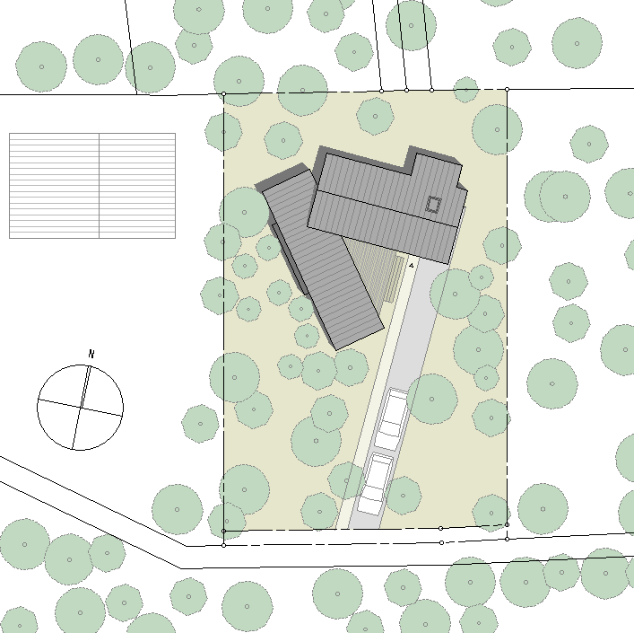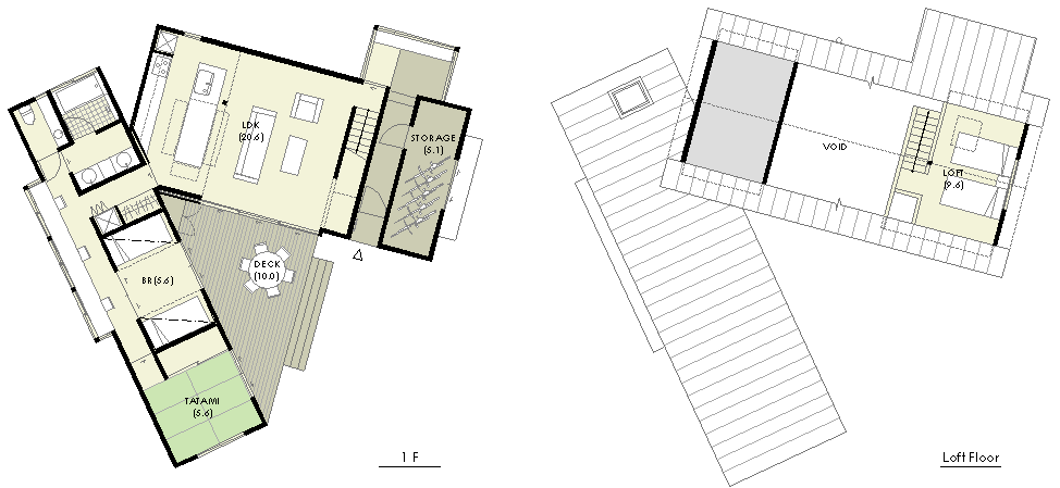 | 計画地 :長野県北佐久郡軽井沢町 | 軽井沢の平坦な森の中に計画された別荘。この地域の厳しい壁面後退の規制と十分な敷地面積のため、周囲にいくつか建つ別荘との間も十分に距離が確保され、敷地境界線の存在を感じさせない敷地である。建物は森の樹々の間にひっそり佇むように、敷地の区画線とは軸線をずらし配置した。LDKのある棟と寝室のある棟を角度をつけて対面させているため、窓から見える風景に自らの建物が映りこみ、2棟に挟まれた三角形のウッドデッキは周囲から少しだけ隔絶された空間として2棟をつないでいる。建物へのエントランスと2棟をつなぐ通路はともに空間を切り替えるトンネル状の空間として、その先に森の風景を対面させている。 |