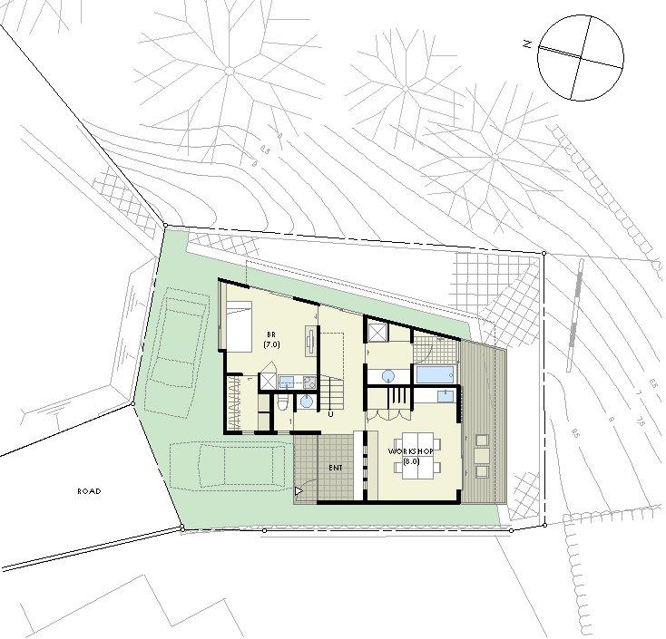 | 計画地 :神奈川県鎌倉市 | 敷地は鎌倉の谷戸のほぼ頂上にあり、周辺の山並と山越しの相模湾を 同時に望むことができる。建物は2台分の駐車スペースを除きほぼ敷地形状 そのまま活用しているが、敷地の2辺に造成され鈍角を形成する擁壁の 上に跳ね出すようにしてバルコニーを長く設けている。 そのバルコニーに面してLDKや寝室、ガラス工房や浴室など各室を配置する ことで、山から海へと連続するパノラミックな風景を家中のいたるところ から楽しめるようにした。 また屋上には江ノ島方面を望むための特別なテラスも設けている。 |