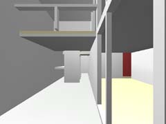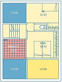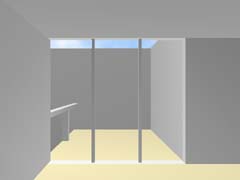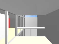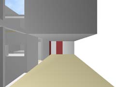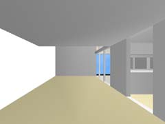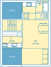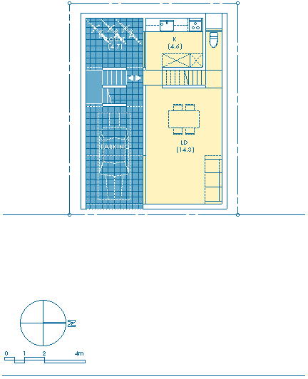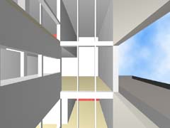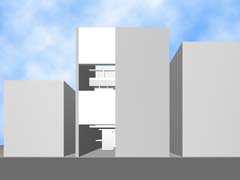 | 計画地 :東京都江東区 | 東側の8m道路以外の3方に4階建程度の隣家が密集した敷地。唯一の道路にも人通りが多くプライバシーの確保が必要である。日影規制対象外となる建物高さ10m以下で4層を積層し、1,2階を親世帯+1人、3,4階を子世帯とに分離した2世帯住宅である。近接した周囲より生活圏を囲いとるためにコンクリートの厚い壁を敷地形状のまま立ち上げ、日照の確保及び建蔽率60%のクリアのための外部吹抜を南側のエリアに2つ配置している。その2つのボイドに沿ってそれぞれの世帯に外部テラスが付属し、1階においてはアプローチと駐車、駐輪スペースを兼ねる光庭へとつながる。階高は限られるため構造床は2層ごとに配置し、2、4階の床は鉄骨パネルとし極力薄くする予定。天井高さの低い分内部吹抜などで空間のメリハリをつけている。外観は窓のほとんどないコンクリート打放しの壁にタイル貼のアクセント壁、外部吹抜へと穿った穴の3種による極力寡黙な表情とする。 |