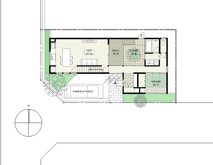 | 計画地 :東京都町田市 | 非常に環境のよい住宅地内の角地における計画。その南面する間口の長さを目一杯活かすように建物は東西に長い建物としていて日照を効率的に室内に取り込んでいる。プライベートな生活を確保するために建物の中央には広い中庭を挟みこんでいて、どこにいても外部の庭やら空を感じとることができ、建物の端から端までの長い距離感が目で見えるような開放的な間取りとしている。 |