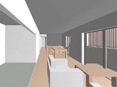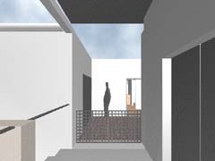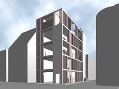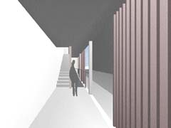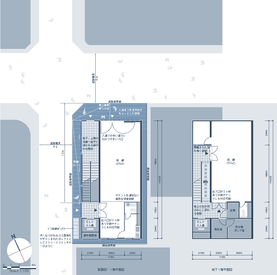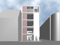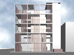 JRの駅に程近い繁華街の中に計画された商業ビルである。 敷地は小規模ながら商業地としての立地には大変恵まれている。現在この場所(1階のみ店舗)にお住まいのオーナー(女性)は引き続きこの地に単身で住まわれることを希望された。商業地域で容積率363%(前面道路幅員による)の地域で2面の道路は幅員6m、4mと狭く道路を挟んだ北西には日影規制を生じさせる近隣商業地域が隣接するというボリュームを確保するにはきびしい条件の土地である。加えてオーナーは5階より富士山が望めることを条件としてあげられ、きびしい条件ながら5階建てとすることが基本要件となった。立地的に恵まれているとは言え、地下階及び3・4階への優良なテナント(飲食以外を希望)を誘致するにはそれなりの集客するための仕掛けが必要だと考え、エレベーターに頼らず地下階及び上階へと客を導くための外部階段及び外部通路空間を長手方向となる道路面に添わせて張り付けた。その外部空間は必要に応じて可動出来る格子(ルーバー)で全面覆われ、中を行き来する客の姿を街に対してプレゼンテーションすることで、さらに新たな客を吸引することと、ルーバー部が開閉することと昼夜における内部の透け方の違いなどにより時に応じて姿を刻々と変化させることが意図されている。ルーバーは5階のオーナー邸まで同じデザインのまま延長され(斜線制限の適用除外を前提としている)、都市居住のためのプライベートなテラスへと転化する。 |