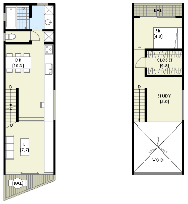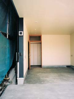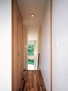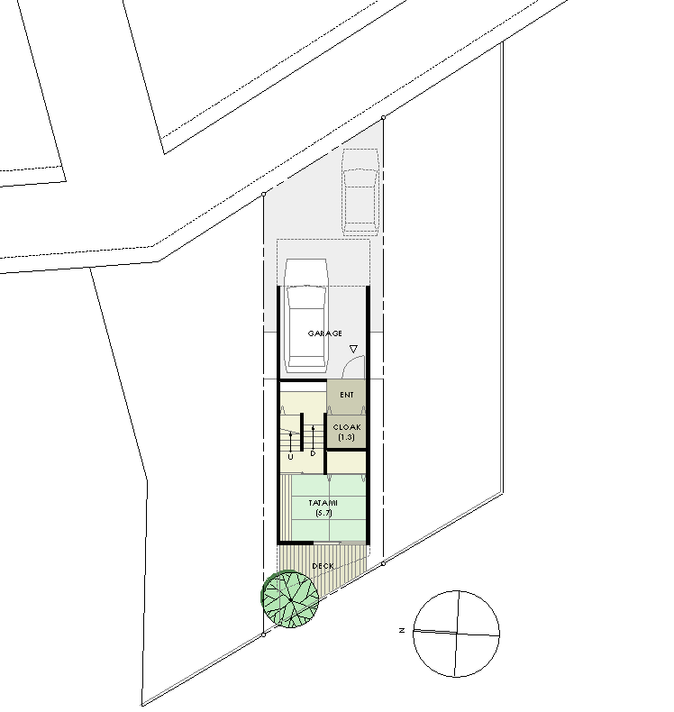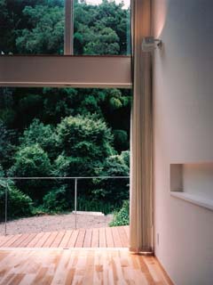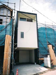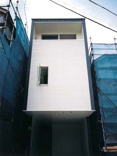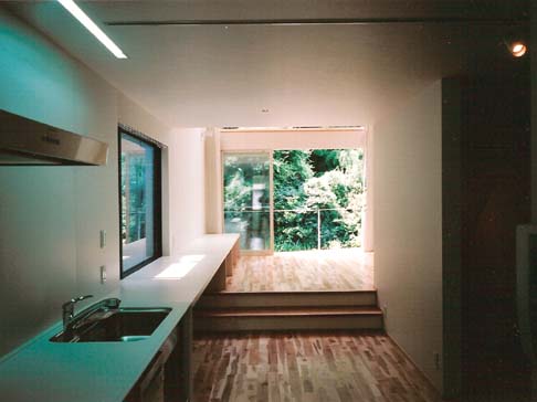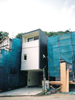 | 計画地 :神奈川県鎌倉市 | 東西に長い間口4.7mの狭小敷地における3階建て住宅。車2台と2世帯が暮らすための家である。南側および北側の隣地は同様な3階建て住宅が近接して建つと予想される。敷地の奥の西側には間近に里山が迫っているので、その里山への眺望を手がかりとして東西に風と視線の抜ける家としている。敷地と道路の高低差を利用したスキップフロア形式として天井高さが多様なワンルーム的空間としているが、段差を活かすことで個々の領域もつくり出している。 |