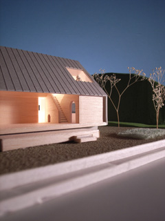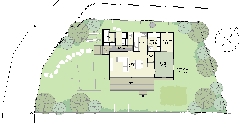 | 計画地 :神奈川県鎌倉市 | 旧鎌倉の奥深い敷地。里山に取り囲まれる市街化調整区域における借地の建替計画。敷地は十分広いが、ローコストとするために建物は極力コンパクトなものに抑え将来の増築の余地を残していて、内装はセルフビルドにて行って頂く予定としている。また周辺の山からの伏流水があふれ出すほどの湿気の多い土地であるため、1階床は高床としている。 |