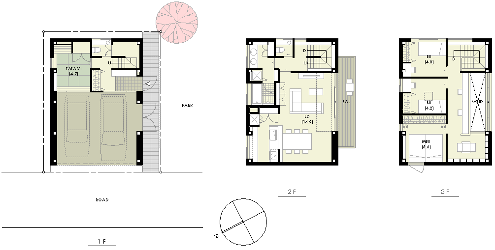| 計画地 :横浜市鶴見区 | 敷地は駅前商店街と幹線道路に挟まれた商業地にあり、周辺は2〜3階建ての古くからの商店や住宅の他、幹線道路に沿って建つ高層マンションもすぐ近くに迫っている。防火地域でもある敷地を最大限に利用するため、鉄骨造(耐火構造)の3階建て住宅としている。幸いに敷地の南側には小規模な都市公園が隣接しているため、玄関までのアプローチを公園に沿って長く設けるとともに、公園のソメイヨシノを借景として室内各所から眺められる住宅としている。 |
