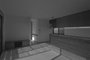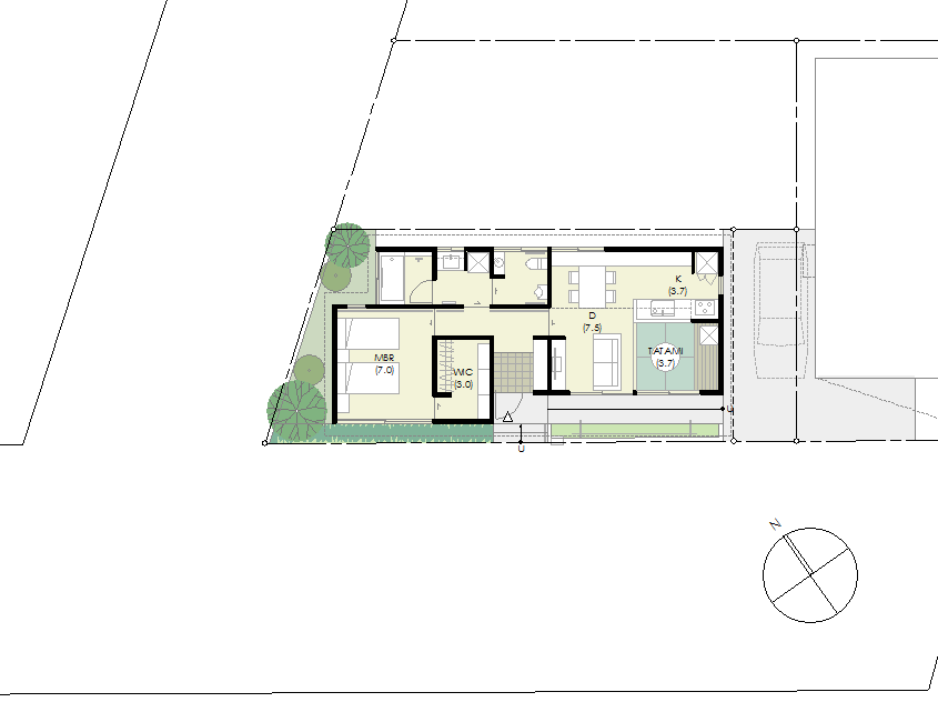 | 計画地 :神奈川県横浜市鶴見区 | 御夫婦が住まうためのバリアフリーな平屋の家。間口の広い南側の広い道路は行き止まり道路で交通量も少ないため日照を得るための大きな開口を南側に設け、玄関アプローチのスロープに沿う板塀にてある程度のプライバシーを確保している。間取りは南側中央の玄関から入って、寝室とLDKの間に水廻りがあるだけの全く無駄の無いプランとしている。屋根は将来的に屋上緑化や太陽光発電の設置を見据えて南向き片流れの大屋根としており、小屋裏部分は全て収納として利用している。 |