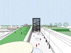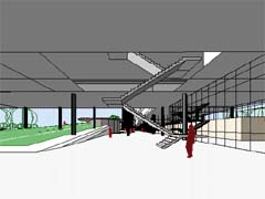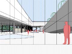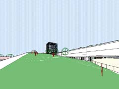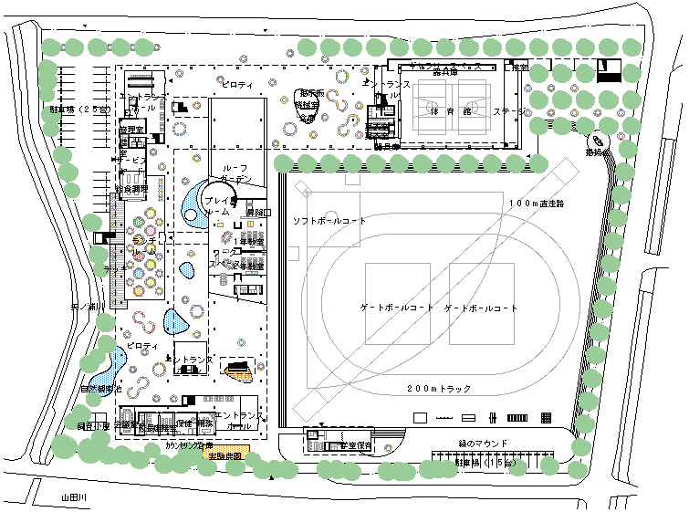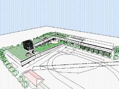 | 計画地 :福岡県山田市 | 学習や事務のための諸室を、ひとつながりのチューブ状の空間に動線と一体化させつつ収納し、日照、アクセス、敷地内での配置を考慮し、折り曲げ、上昇させてゆく。チューブの下には、ランチルームや屋外学習のためのスペースなどオープンで多目的な空間を配し、チューブ上は屋上庭園として児童の活動の場を拡げている。 |