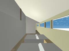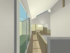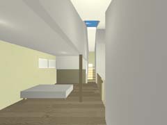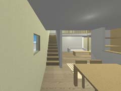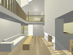 | 計画地 :神奈川県相模原市 | 4m道路が鋭角に交差する角地にある住宅。隣家の迫る南東に4間半×4間半の正方形プランを寄せ、角地部分はドライブスルー可能な駐車スペース兼用の空地として街に開放している。2方向から制限される道路斜線により設定された非対称切妻屋根のもとに収納用の中間階を挟み込んだスキップフロア形式の間取りを組み込んでいる。窓の取りにくい1階の各所には、吹抜けごしに上方からの光が浸透していくような構えとしている。 |