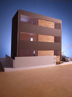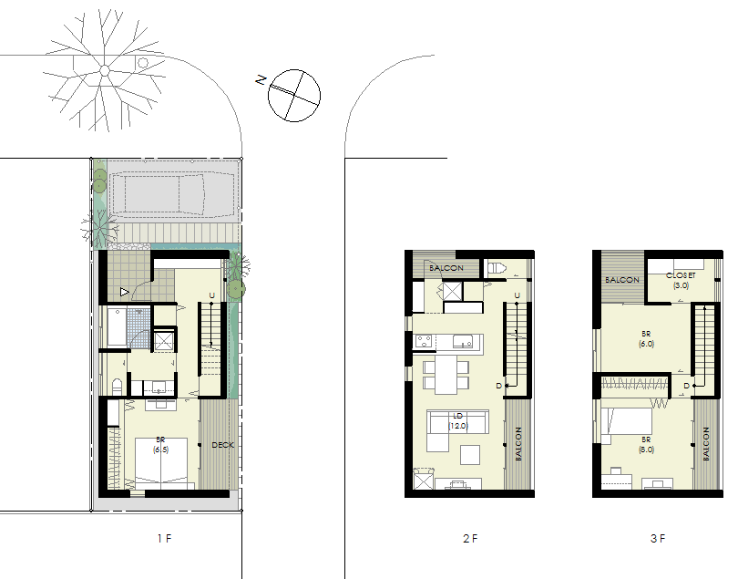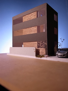 | 計画地 :横浜市鶴見区 | 4車線の車道と歩道のある大きな通りに面する狭小敷地。大通りとは別に4mの生活道路に広く面していて下町の雰囲気も残る角地であるが、そこに建っていた店舗併用住宅の老朽化のため新たに2世帯同居の3階建て住宅への建て替えの計画となった。防火地域内の3階建てに該当するために耐火構造である必要があり構造は鉄骨造を採用している。但し間取り自体は木造住宅と同じようなスケールを用いているため、10センチ角の鉄骨柱によるブレース付ラーメン構造とすることで鉄骨造独特の柱型や梁型の室内への突出は極力避けている。また建て替え前の家にはなかった駐車スペースも今回は1台分新たに設けている。外壁はガルバリウム鋼板のスパンドレル張としたシンプルな箱型にまとめ、住宅地でない立地に合わせてあまり住宅風ではない小さなビル風の外観としている。耐火構造の建物であるが、外壁の一部や内部に木材を多く用いることやアプローチ廻りの緑を充実させることで以前と同じような下町の風景になじむような建物となるようにと意識した。 |