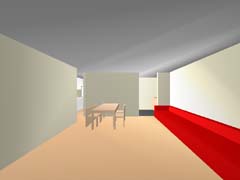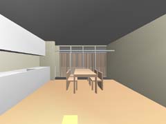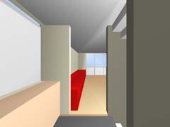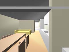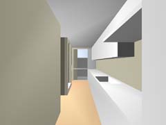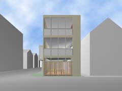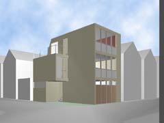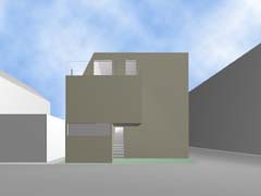 | 計画地 :東京都世田谷区 | 比較的穏やかな印象の住宅地の中、三叉路のコーナーにある20坪の敷地。巾と方角の割と良い2面道路を手がかりに、この狭小の敷地に高齢者2人+3人+車1台の完全分離2世帯住居を埋め込む。住宅地での斜線制限、建蔽率の中で最大のボリュームを確保し、1階をバリアフリー及び介護を意識した親世帯、2、3階を子世帯へと配分する。コストと高齢者の居住環境を考慮し、地下、半地下の利用はあきらめている。極限的な空間の分配の過程の中で、廊下と呼ばれるようなものは徐々に排除されていき、室相互が直接連鎖していくような構成となっている。 |