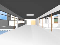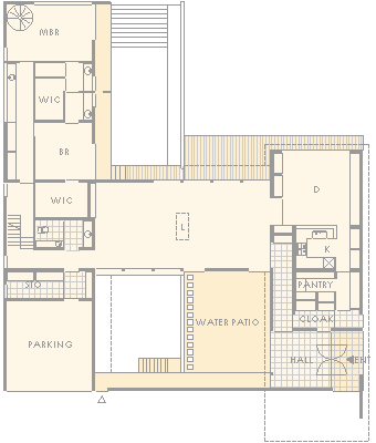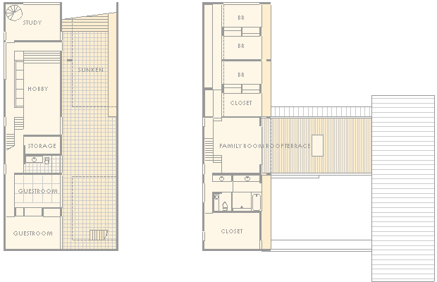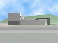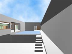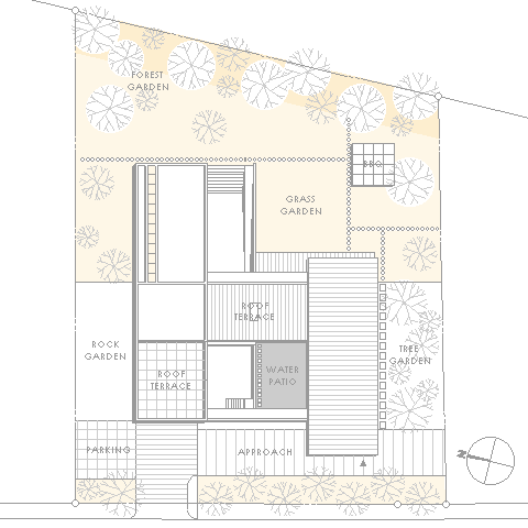 | 計画地 :神奈川県逗子市 | 首都圏内としては格段の広さの敷地の東側には、高台に有る公園へと至る斜面が緑地として存在していて、建主はその緑地への眺望を何よりも優先された。厳しい建蔽率制限、高さ制限のおかげで、要求される内部空間はこの広い敷地面積にもかかわらず総2階建てとしても納まりきらないほどのボリュームであったが、H形の配棟の間にサンクンガーデンを設けて一部地下とすることで東への眺望、南からの日照、道路・隣地からのプライバシーを確保している。 |