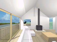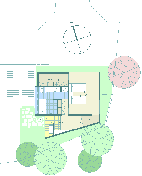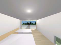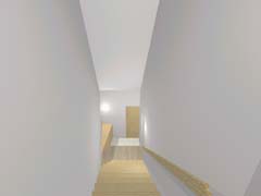 | 計画地 :神奈川県逗子市 | 谷あいの北斜面を造成した敷地。南側はがけと木々が高く敷地に覆いかぶさり日照は期待できないけれども、北と北東側には山を望む眺望が開けている。低くなった北道路の斜線制限と、南のがけの崩壊対策の建築制限によって、建物の配置や高さにはかなりの制約がある場所に、2人と猫一匹のための小さな家が求められた。2階の北向きの眺望を活かすために2階に居間、1階に寝室と水廻りとをシンプルな形状の切妻の内部に配置し、がけに沿う変形敷地部分には、既存の敷地内階段のアプローチからそのままスパイラル状に2階へと導くかたちで、光の演出の施された玄関(階段)ホールを付け加える形とし、明解なプランニングとしている。 |