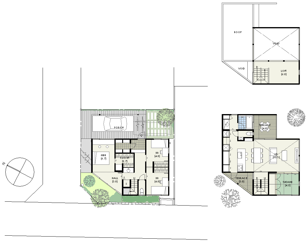 | 計画地 :神奈川県逗子市 | 海岸にも程近い閑静な住宅街、ひときわ目立つであろう角地に位置する住宅の計画。正方形に近い土地のコーナーの隅切部分と、その対角の部分とにオープンスペースを設けることで隣接する各部屋に通風と採光や眺望をもたらすことができるとともに、来客時の臨時駐車スペースとしても利用可能としている。2階に設けられた居間は表と裏の2つのテラスを設けることでその不利を解消しつつ、高い天井高や日照、屋上利用などで2階リビングの利点を最大限に活かしている。 |
